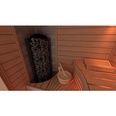 • Вертикальное размещение камней позволяет менять характер тепла в зависимости от подачи воды: сверху для интенсивного горячего парения и сбоку для мягкого и легкого пара.